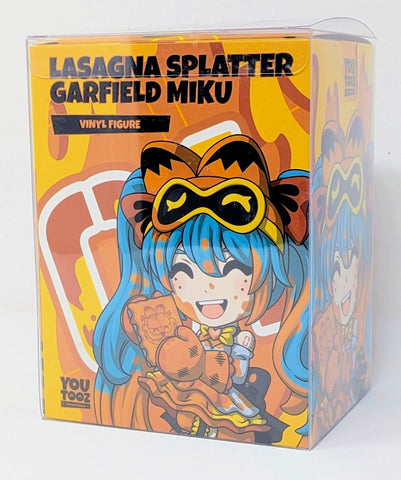 Covered in cheesy lasagna goodness and standing at 5.1 inches tall with a huge smile and blushing cheeks, she proudly holds a tin of freshly baked lasagna with Garfield’s face on the front. With long orange splattered bangs covering her forehead and wearing a Garfield headband with short round ears and pale orange eyes, red hair ties hold her long twintails in place as they fall down to rest on the ground and she wears large orange oven mitts and thick boots with her leg kicked up. Dressed to bake all your worries away, a love heart collar sits at her throat as her stained blue dress sits around her shoulders with ruffled orange and red pleats fanning out from her waist while a long orange and black striped tail rests at her side.!